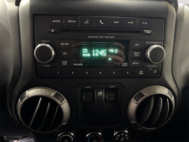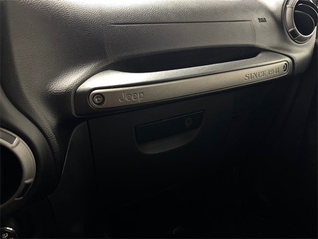 Connectivity Group (Remote USB Port, Tire Pressure Monitoring Display, and Uconnect Voice Command w/Bluetooth®), Power Convenience Group (Auto-Dimming Mirror w/Reading Lamp and Security Alarm), Quick Order Package 24W Willys Wheeler (3.73 Rear Axle Ratio, 4-Wheel Drive Swing Gate Decal, Air Conditioning, Black Jeep Grille Badge, Deep Tint Sunscreen Windows, Wheels: 17 x 7.5 High Gloss Black Willys, and Willys Hood Decal), 16 x 7.0 Luxury Styled Steel Wheels, 3.21 Rear Axle Ratio, 4-Wheel Disc Brakes, 8 Speakers, ABS brakes, AM/FM radio, Audio Jack Input for Mobile Devices, Black 3-Piece Hard Top, Brake assist, CD player, Cloth Seats w/Adjustable Head Restraints, Compass, Driver door bin, Driver vanity mirror, Dual front impact airbags, Electronic Stability Control, Freedom Panel Storage Bag, Front anti-roll bar, Front Bucket Seats, Front Center Armrest w/Storage, Front fog lights, Integrated roll-over protection, Low tire pressure warning, Normal Duty Suspension, Occupant sensing airbag, Outside temperature display, Passenger door bin, Passenger vanity mirror, Power steering, Radio: 130, Rear anti-roll bar, Rear Window Defroster, Speed control, Steering wheel mounted audio controls, Sunrider Soft Top, Tachometer, Tilt steering wheel, Traction control, Trip computer, and Variably intermittent wipers.