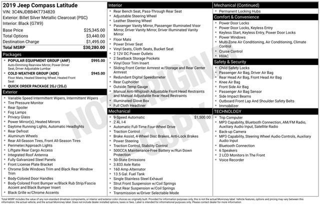 This 2019 Jeep Compass Latitude offers an impressive array of premium features that elevate the driving experience. Highlights include the Cold Weather Group with heated steering wheel and front seats, the Popular Equipment Group with power driver's seat and 7-inch driver information display, and the 9-speed automatic transmission with Autostick. You'll also enjoy the convenience of dual-zone climate control, remote keyless entry, and a rearview camera.