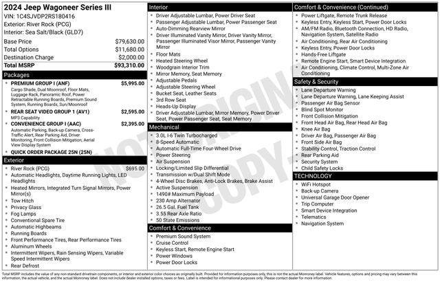Whether you're embarking on a family road trip or tackling the great outdoors, this 2024 Jeep Wagoneer Series III is ready to take you there in style and comfort. With its impressive capabilities, premium features, and exceptional attention to detail, this Wagoneer is a true standout in its class.